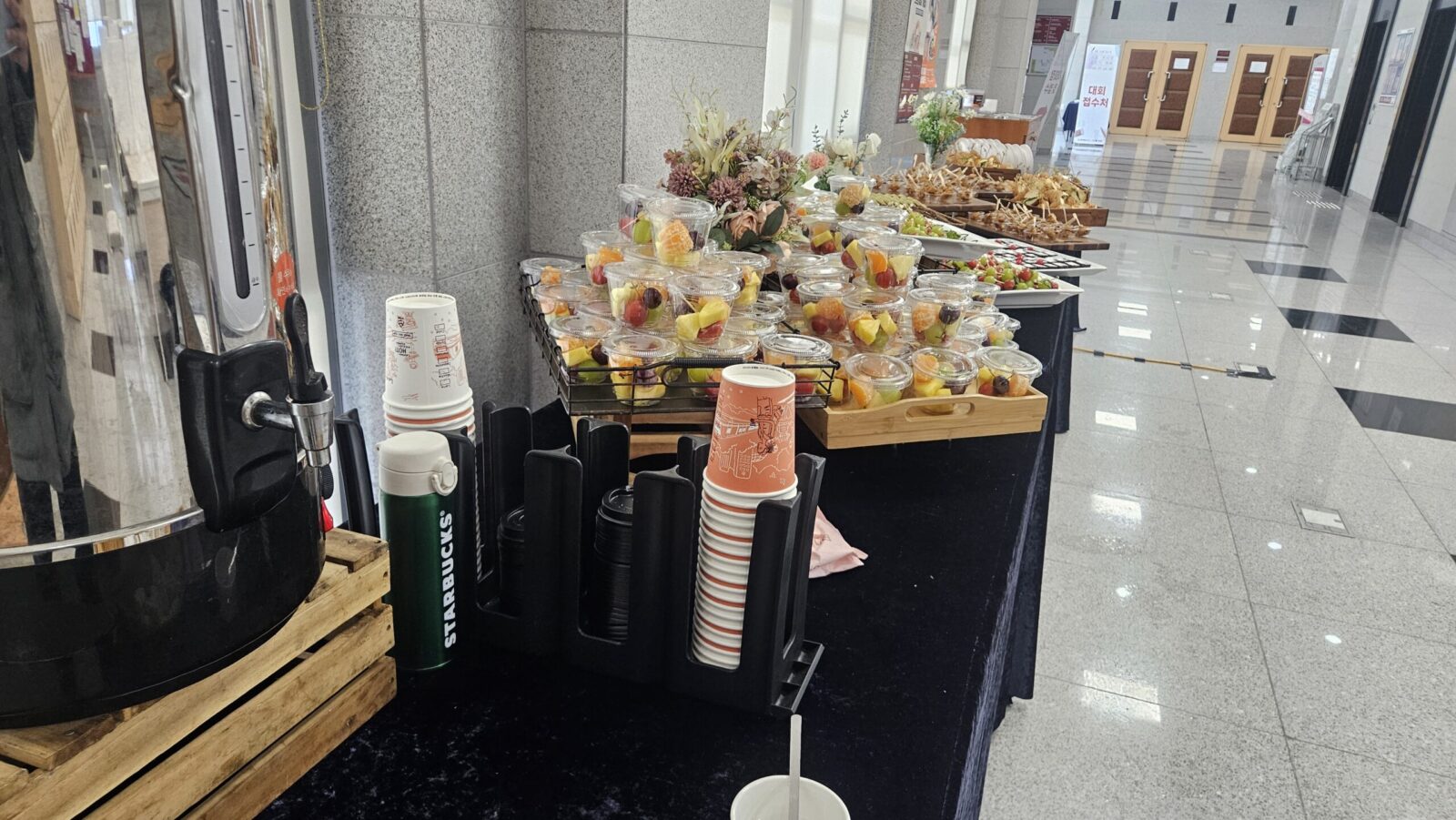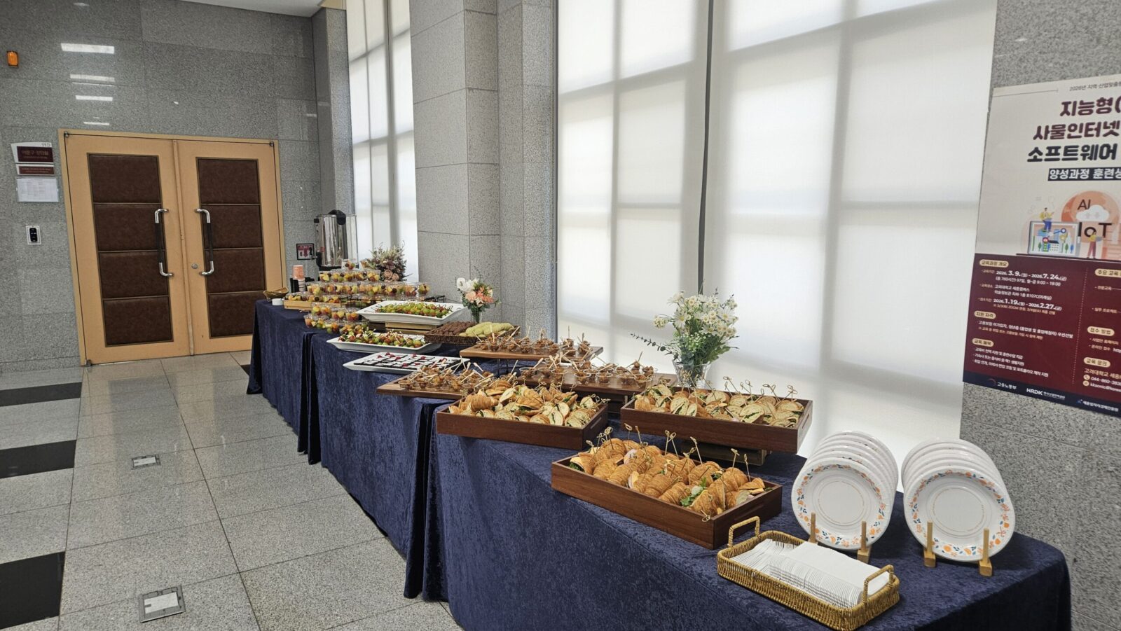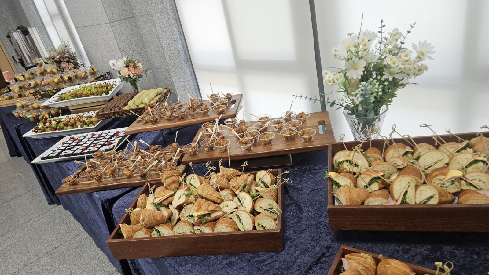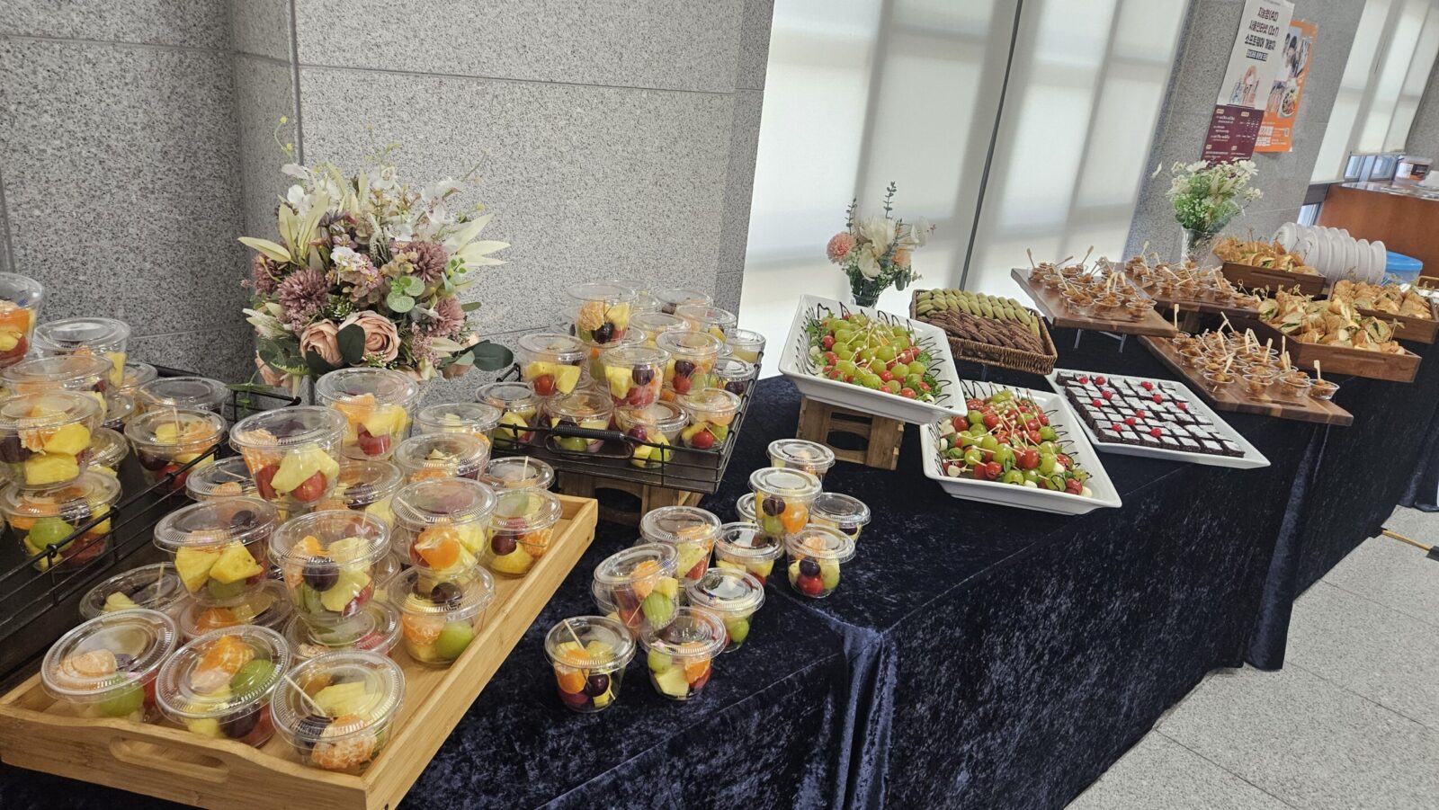 이번 행사는 60명 규모에 맞춰 다과 중심의 케이터링으로 구성했으며, 행사 흐름을 방해하지 않도록 간결하고 깔끔한 형태로 준비했습니다. 특히 학생과 관계자들이 함께 이용하는 자리인 만큼, 이동 동선과 음식 접근성을 고려해 테이블 배치와 구성에 세심하게 신경을 썼습니다.
