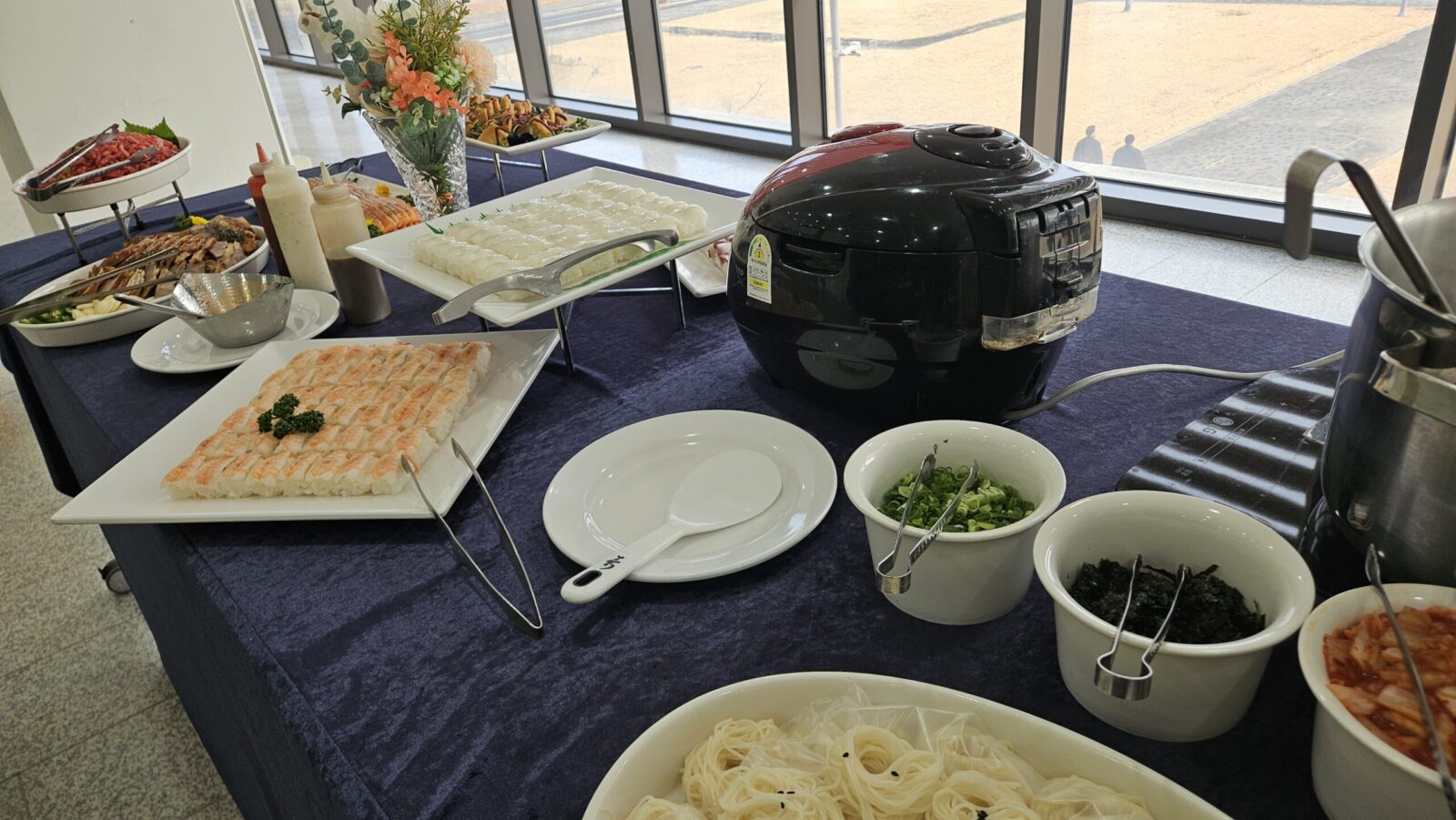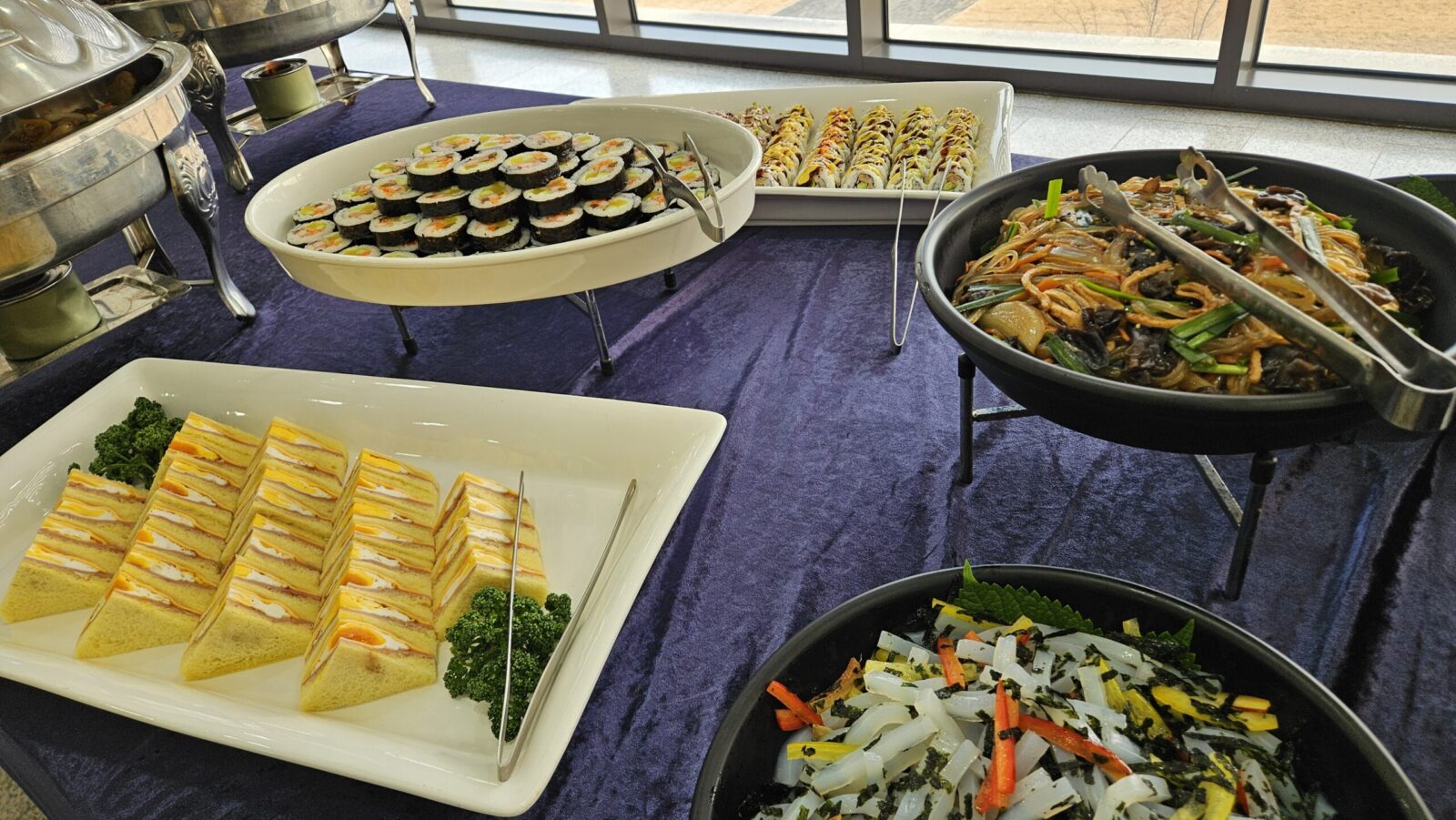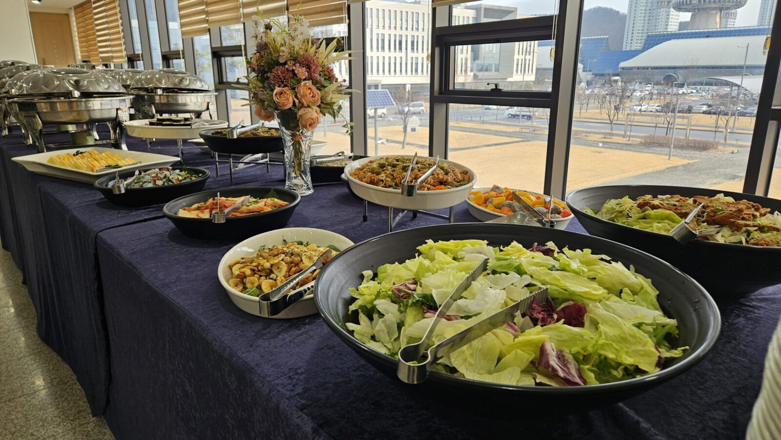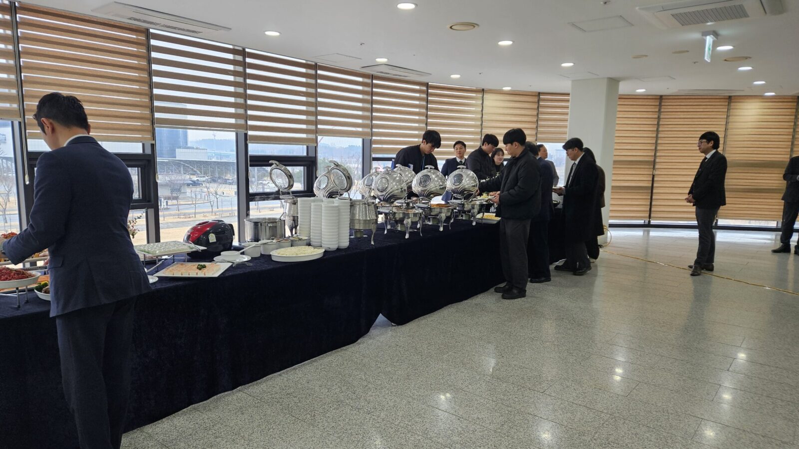 이번 시상식에서는 약 50명 규모의 참석자를 대상으로 출장 뷔페를 준비했습니다. 시상과 발표가 중심이 되는 행사인 만큼, 음식이 행사 흐름을 방해하지 않도록 과하지 않은 구성과 안정적인 세팅을 우선으로 했습니다. 참석자들이 짧은 휴식 시간 동안 편안하게 이용할 수 있도록 공간 동선과 테이블 배치를 세심하게 고려해 준비했습니다.